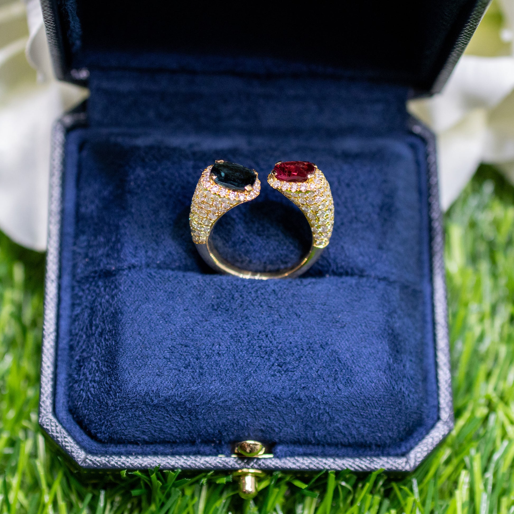 Blue and Red Spinel Bypass Ring Diamond Setting 4 Carats 18K Gold