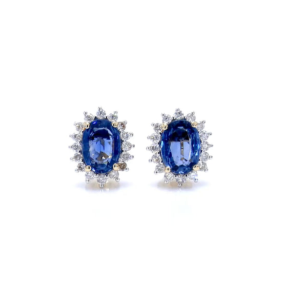 Blue Sapphire Earrings Halo Diamonds 2.2 Carats 14K Yellow Gold