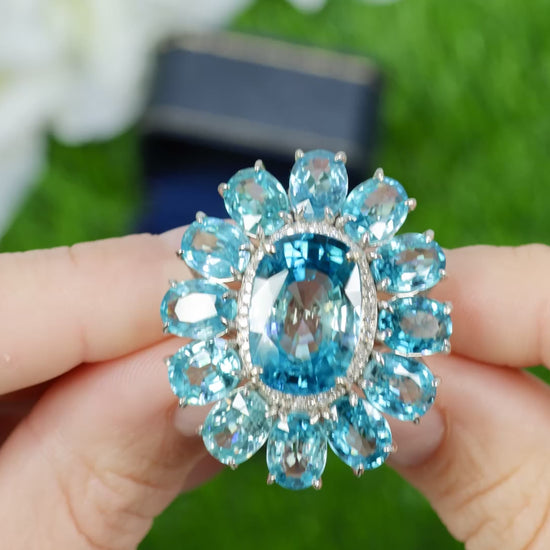 Blue Zircon Cocktail Ring Diamond Halo 30 Carats 14K Gold