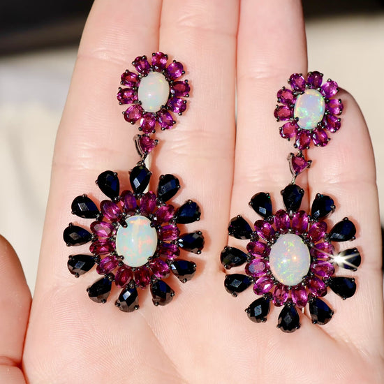 Ethiopian Opal Dangle Earrings Rhodolite and Black Spinel 29 Carats