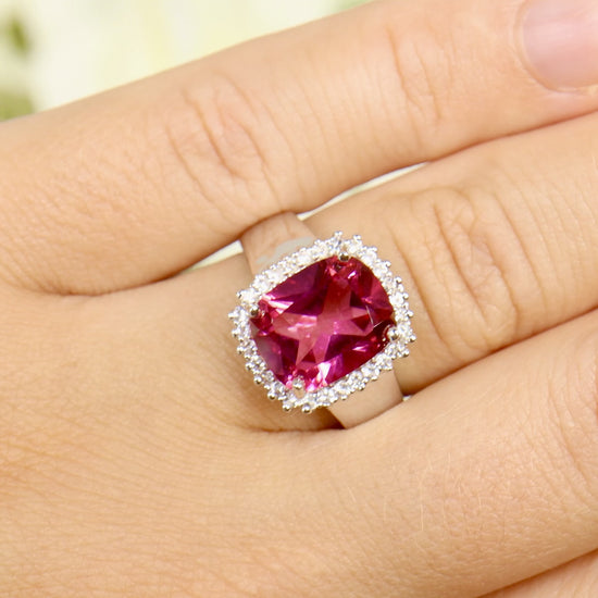 Hot Pink Topaz Ring White Topaz Halo 4.4 Carats