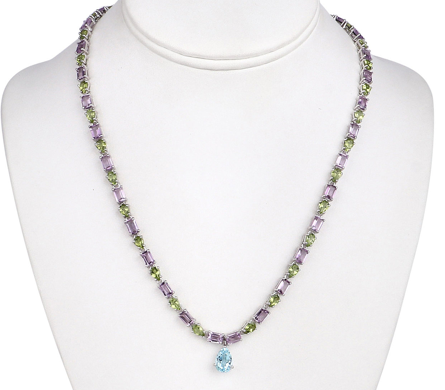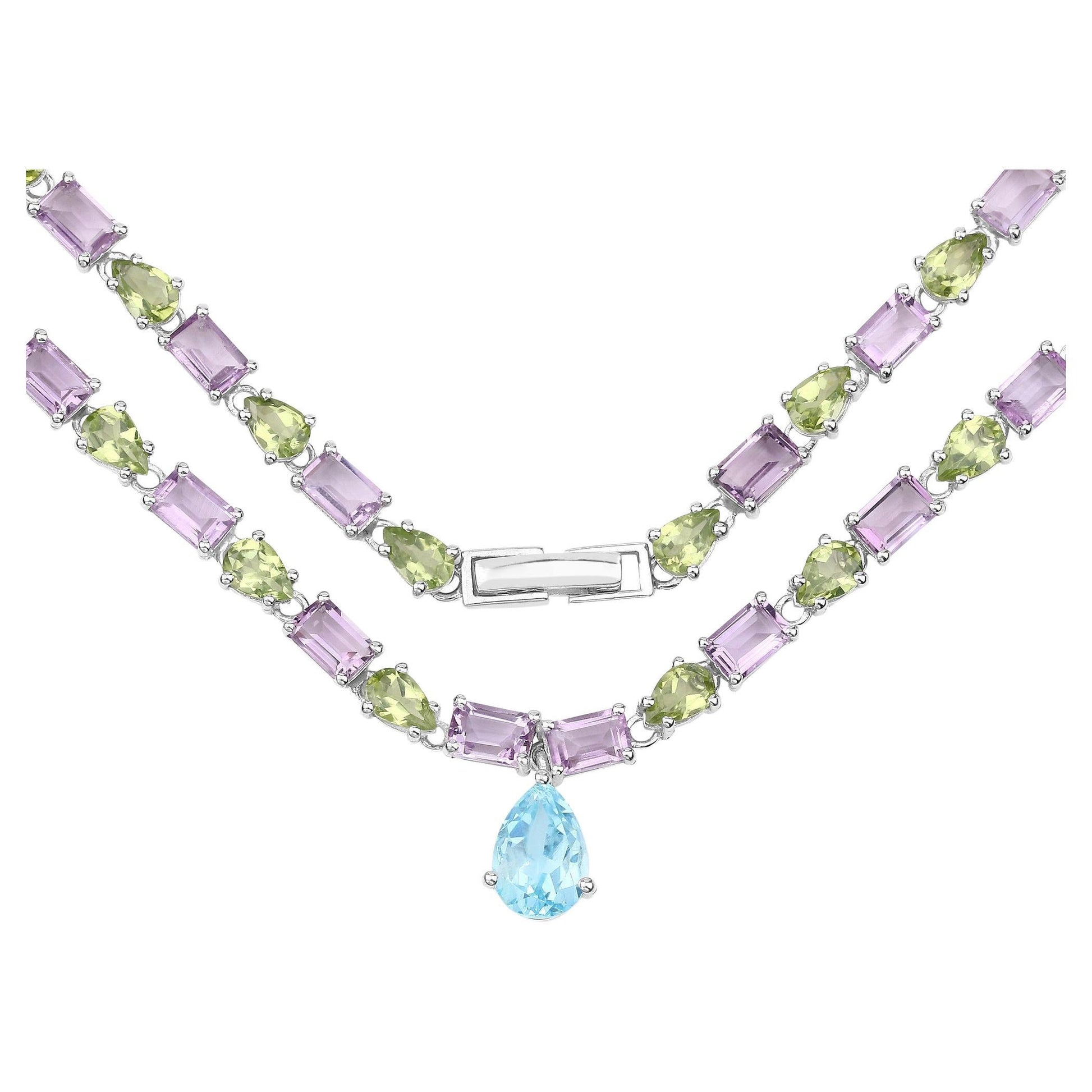 Natural Blue Topaz Amethyst and Peridot Eternity Necklace 32 Carats Silver