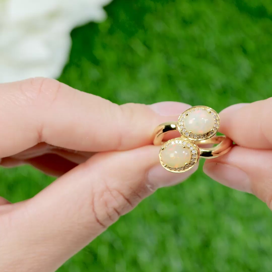 Natural Opal Bypass Ring With Diamonds 1.91 Carats 24K Yellow Gold Plated Silver