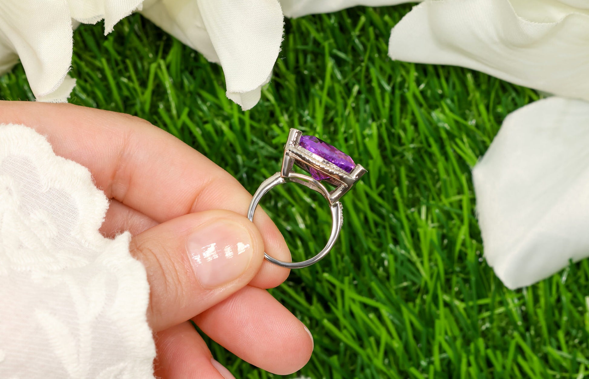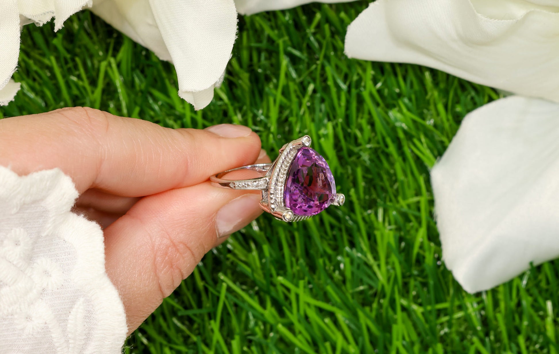 Trillion Cut 8.15 Carat Amethyst Ring With White Topaz